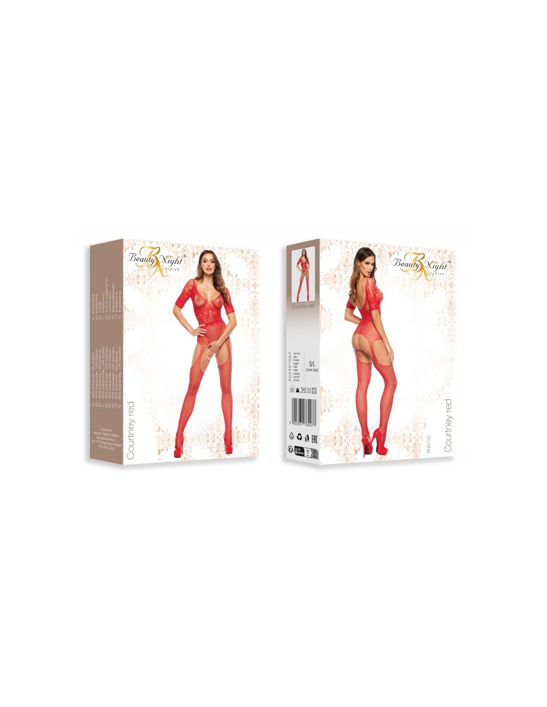 Bodystocking "Courtney Red" très sexy pour les amatrices de sous-vêtements confortables, en fil rouge délicat. La partie supérieure est un T-shirt sexy à manches courtes décoré d'applications florales et d'une ceinture soulignant la taille. La partie inférieure est un bas résille classique.