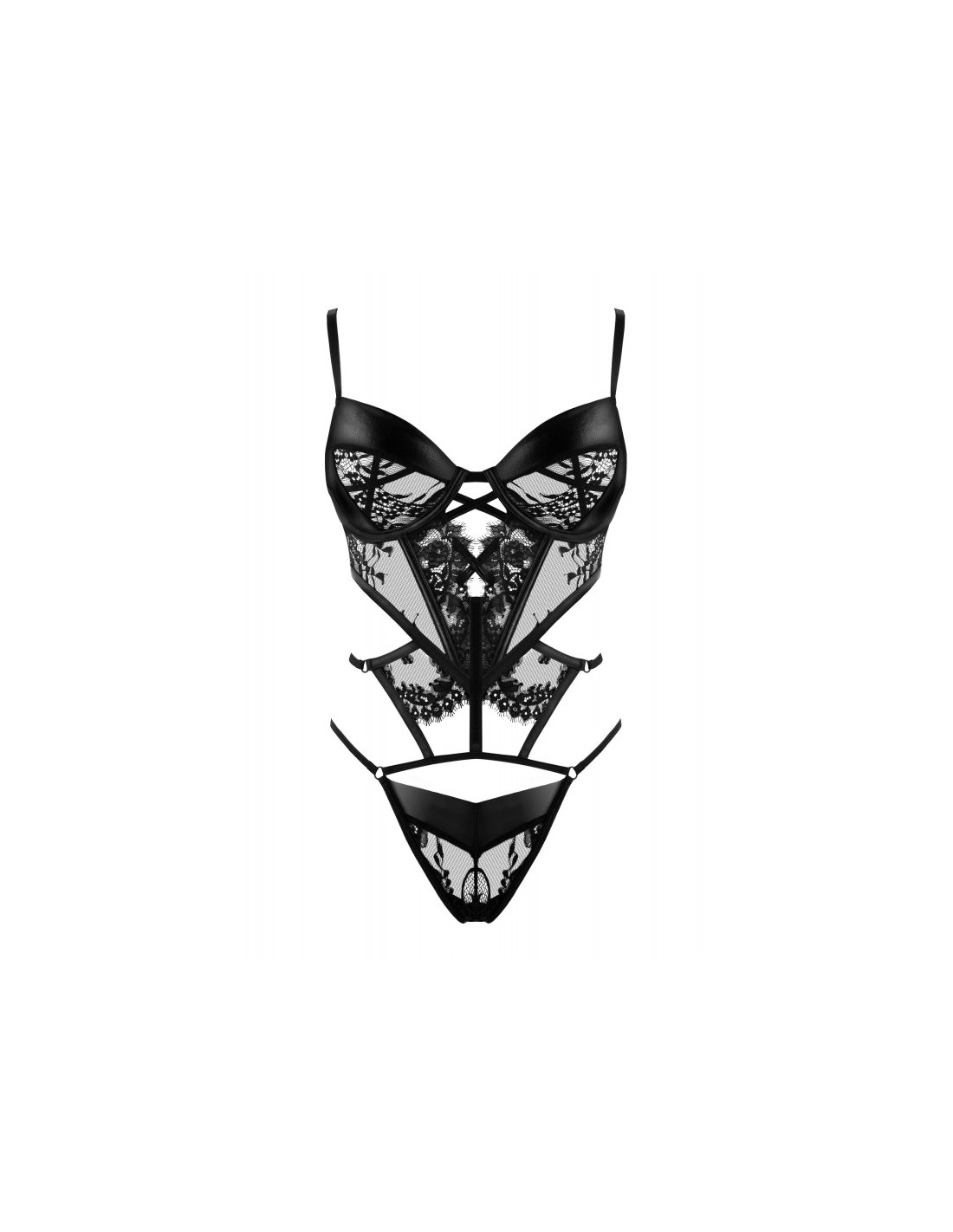 Ce Body "Leonela Black" de couleur noir en fine maille et dentelle avec des empiècements en simili cuir, sublimera vos cordes dans de jolis motifs.
