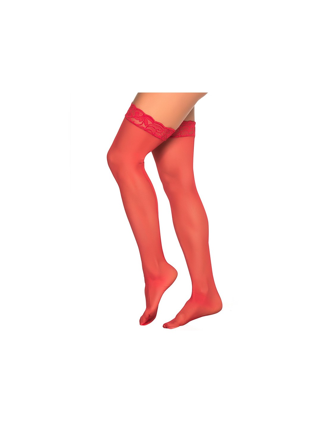Très beau bas nylon opaques rouges fins et délicats. Ces bas autofixants sont terminés par une jolie jarretière dentelle. A l'intérieur de la jarretière, une large bande de silicone garantissant le maintien sur la cuisse.