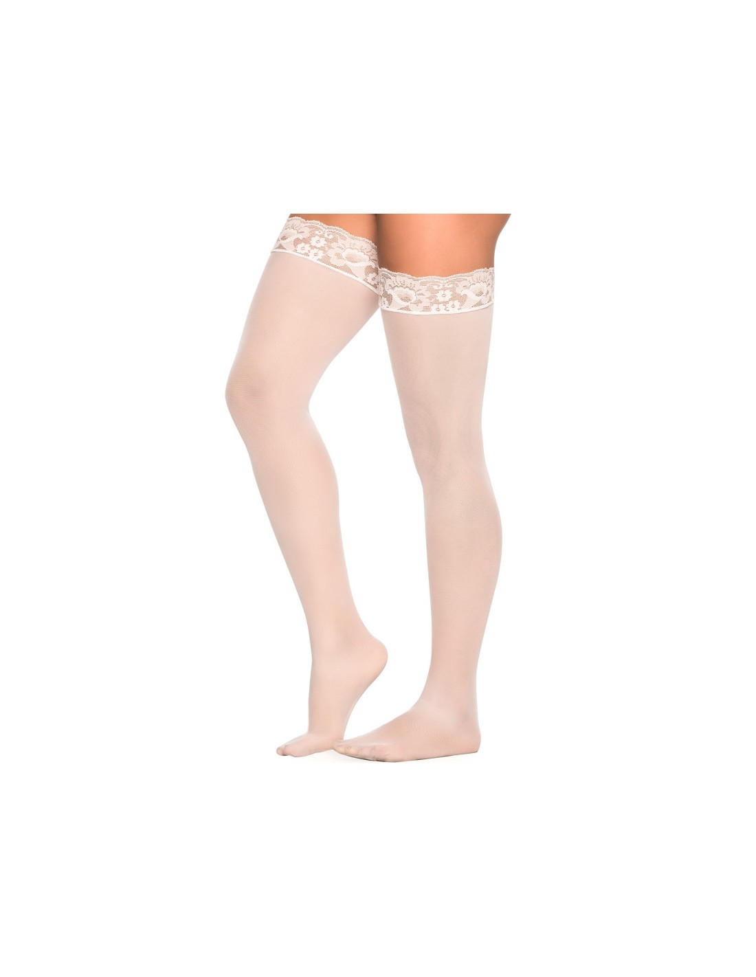 Très beau bas nylon opaques blancs fins et délicats. Ces bas autofixants sont terminés par une jolie jarretière dentelle. A l'intérieur de la jarretière, une large bande de silicone garantissant le maintien sur la cuisse.