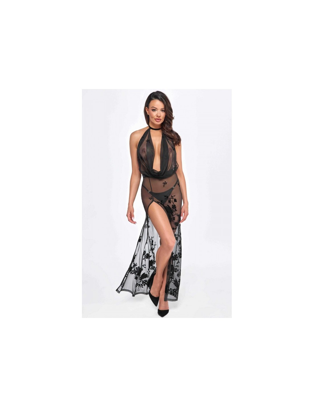 Réveillez votre passion intérieure dans cette Robe "F312 Divinity Longue" en maille floquée transparente. Avec son dos entièrement ouvert, sa luxueuse bordure en velours dans le bas du dos, son col en velours, sa fente sexy au niveau des jambes et son devant captivant et fluide, préparez-vous à être hypnotisée.
