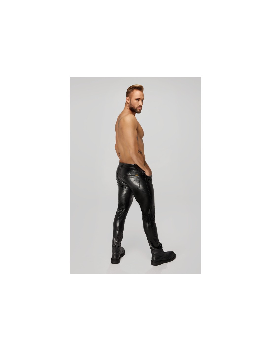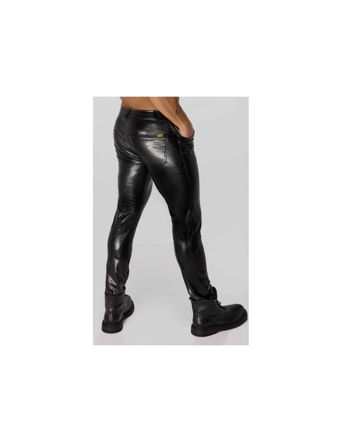 Le pantalon Snake wetlook est un élément essentiel de la garde-robe de tout homme BDSM. Accès facile grâce à une fermeture à glissière et un bouton sur le devant, il est agrémenté de poches élégantes sur les fesses.