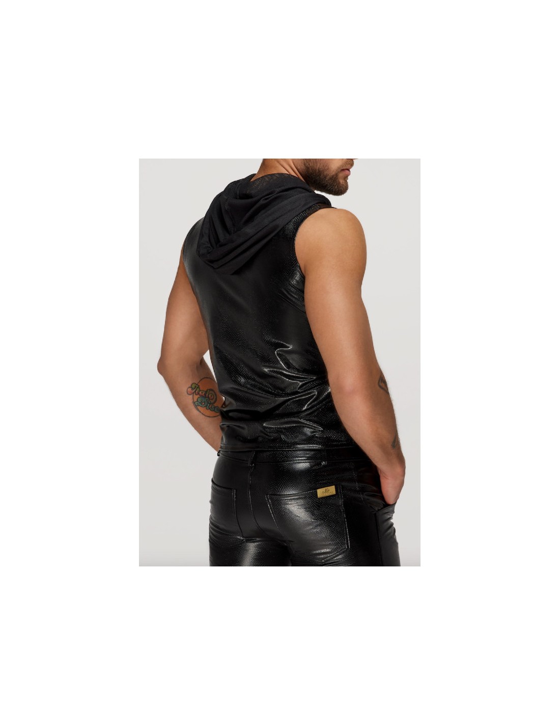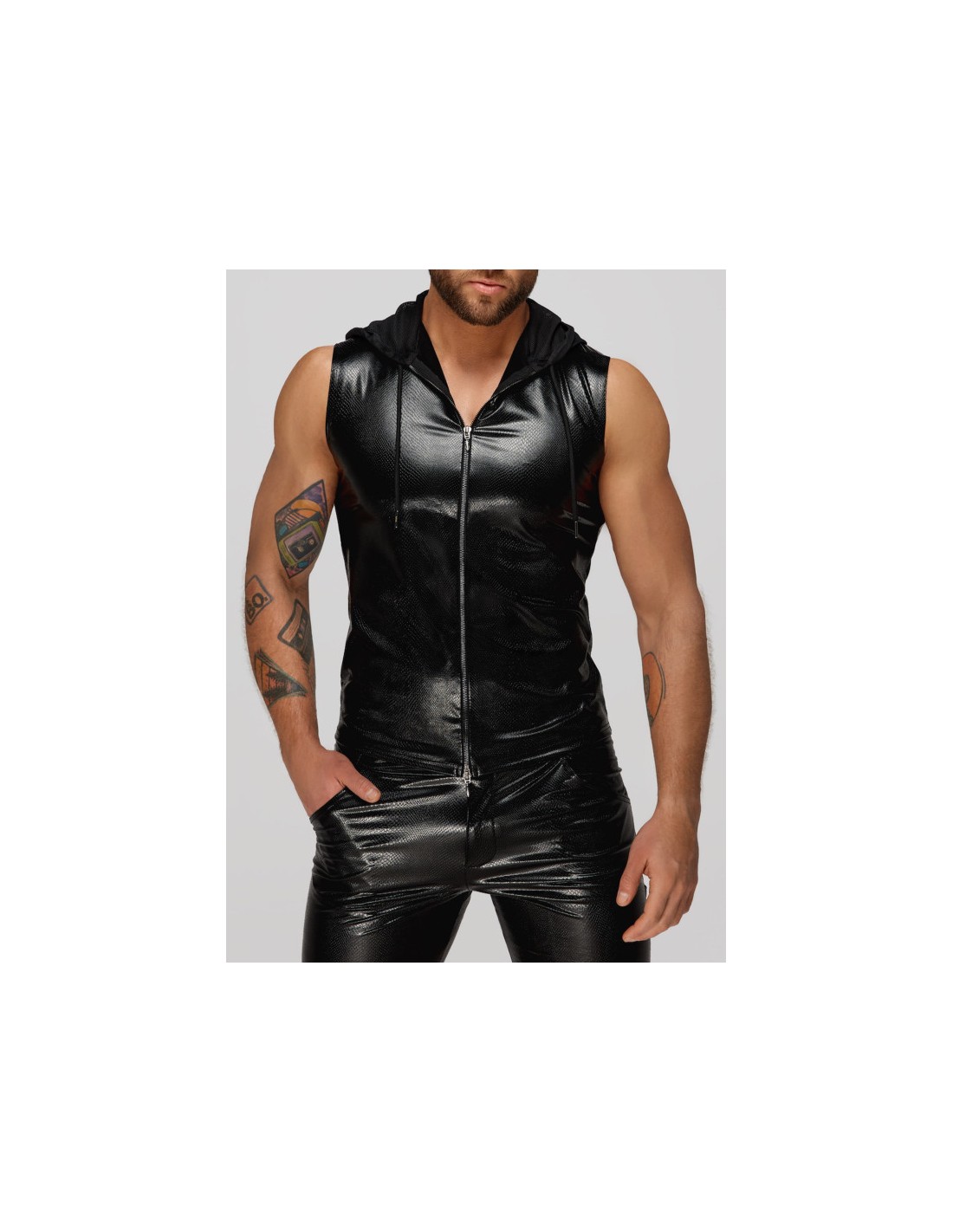 Tous les hommes sont ultra excitants dans ce haut sans manches super sexy. Fabriqué dans un look serpent très tendance, il est doté d'une capuche transparente.
