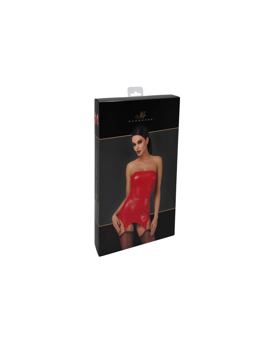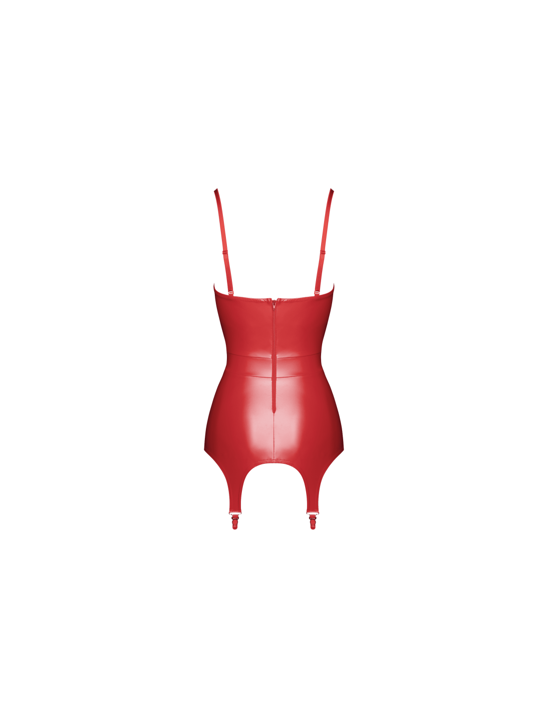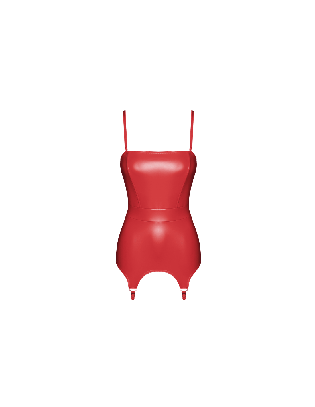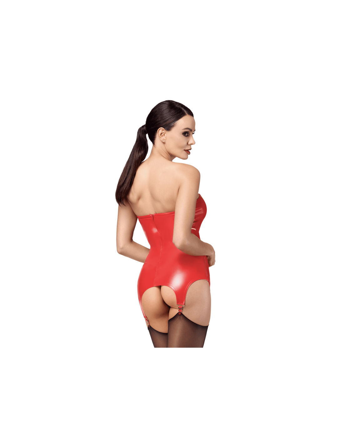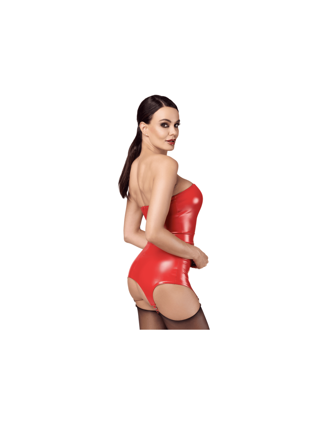 Cette guêpière est en tissu powerwetlook rouge. Coupe accentuant la taille avec un haut structuré de style corset avec baleines pour la structure et le soutien. Elle se ferme sur l’arrière avec une fermeture éclair. La section inférieure fonctionne comme un porte-jarretelles avec quatre sangles et clips.