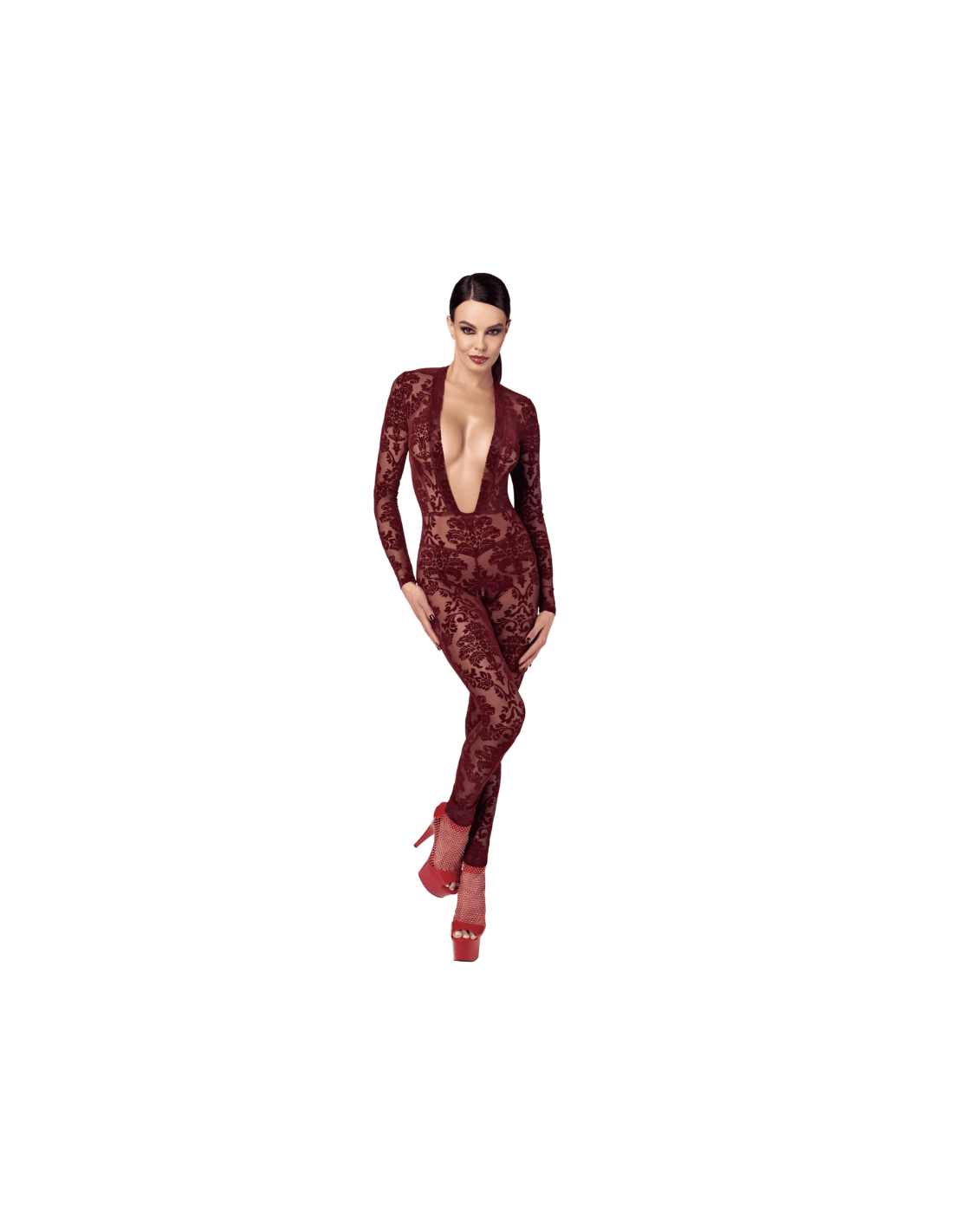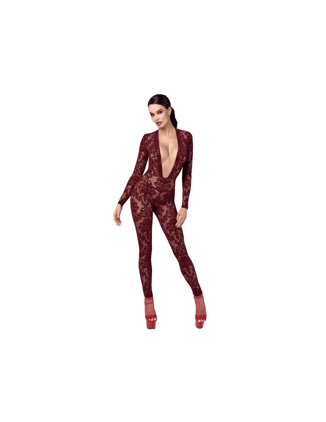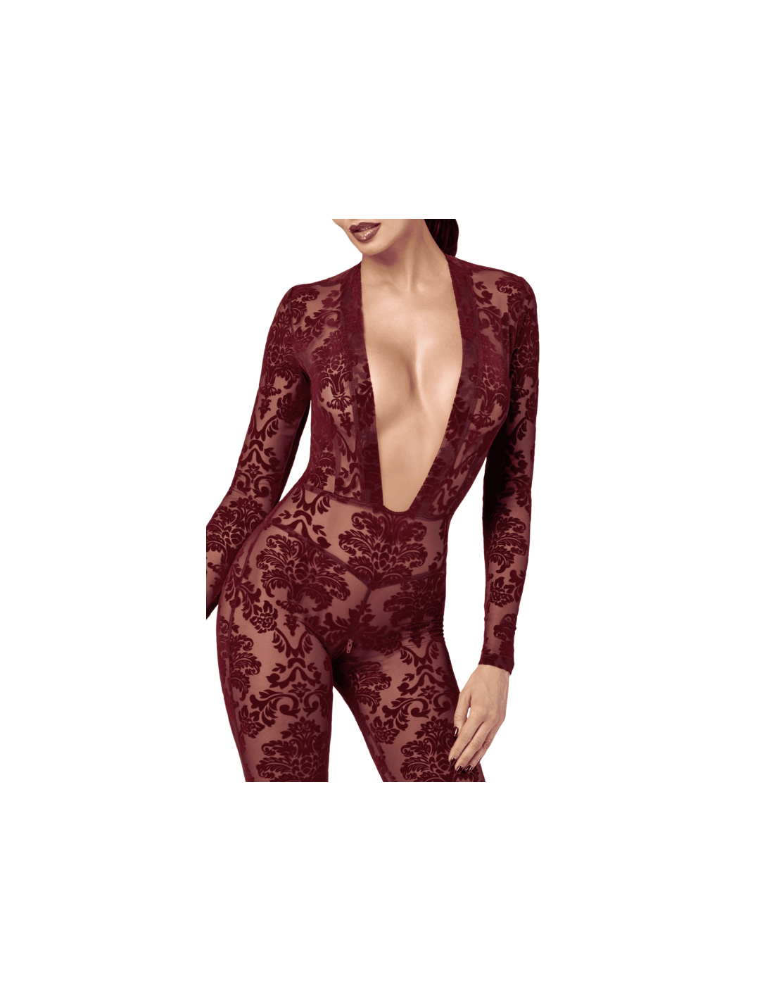 Cette combinaison est en tulle floquée bordeaux, dotée d’une profonde encolure en V, de manches et de jambes longues, avec une fermeture éclair dans la zone de l’entrejambe pour plus de commodité.