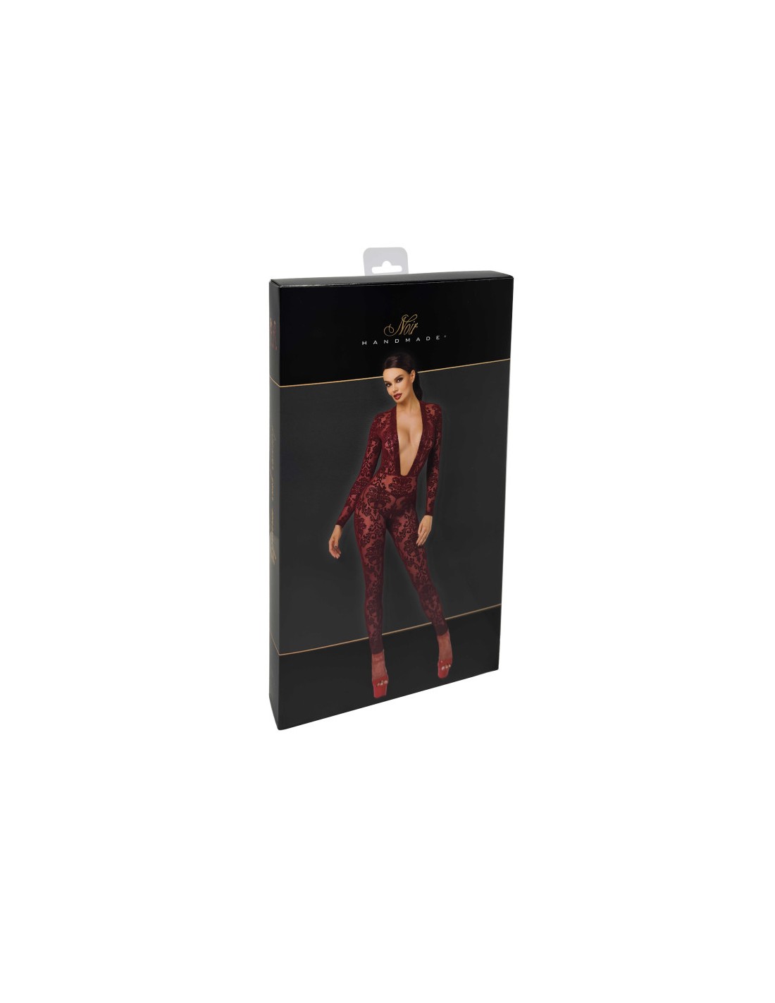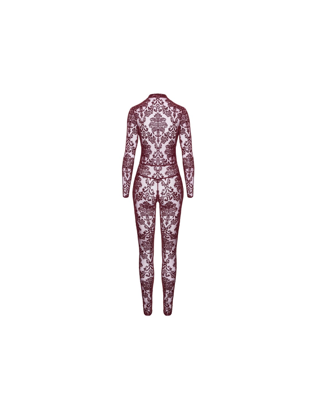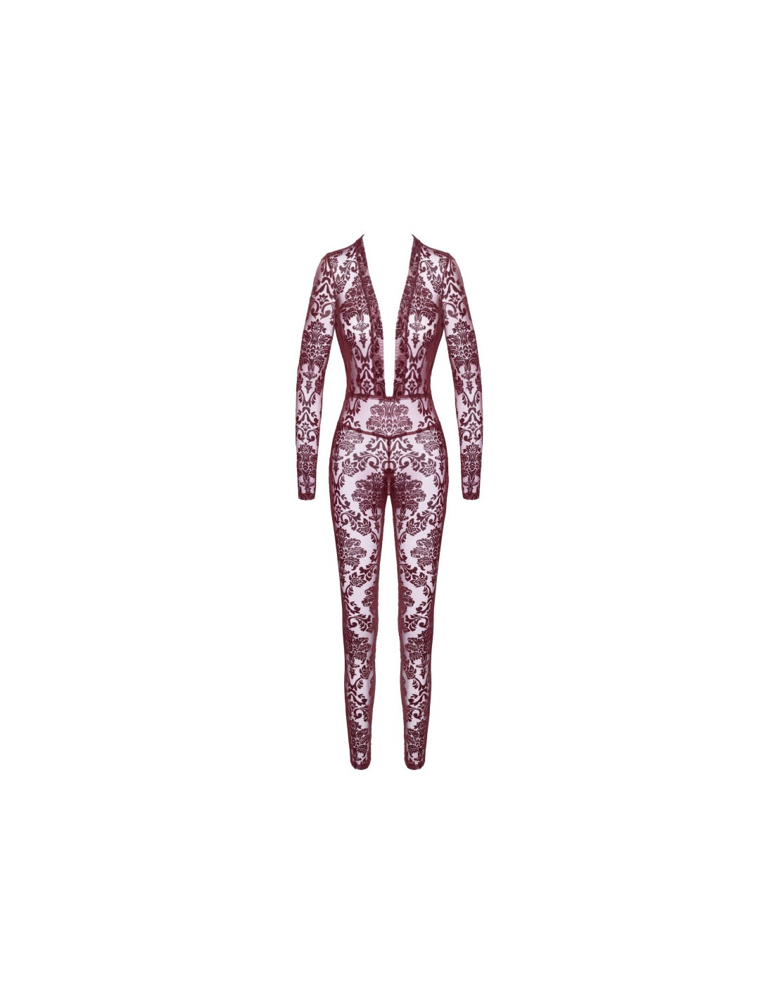 Cette combinaison est en tulle floquée bordeaux, dotée d’une profonde encolure en V, de manches et de jambes longues, avec une fermeture éclair dans la zone de l’entrejambe pour plus de commodité.