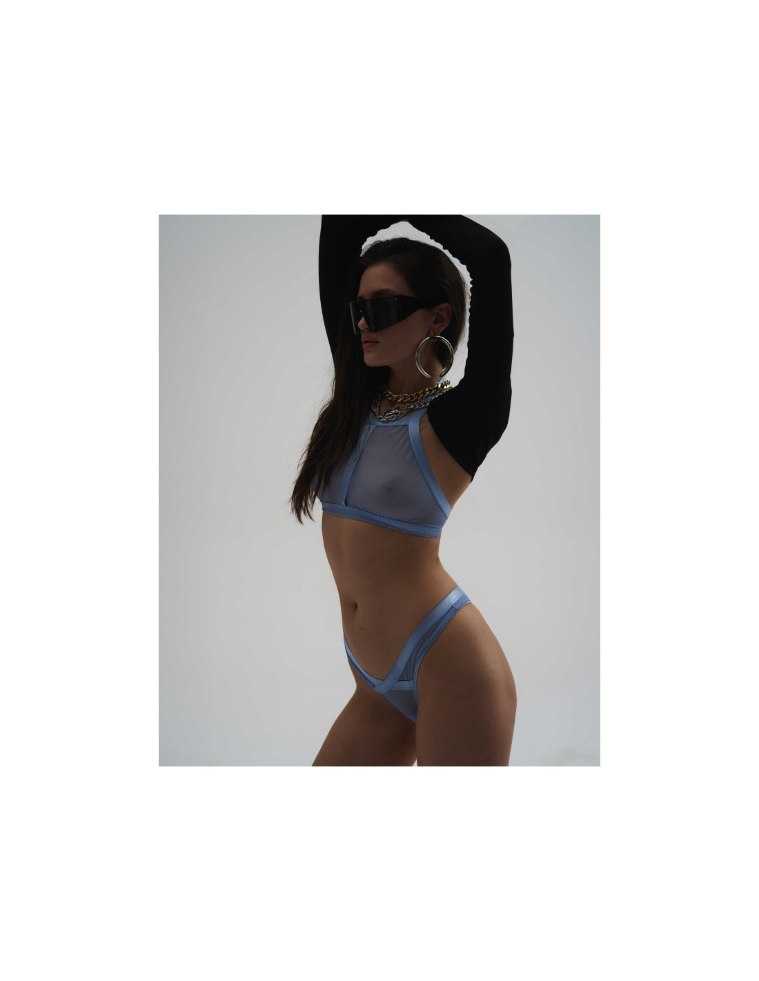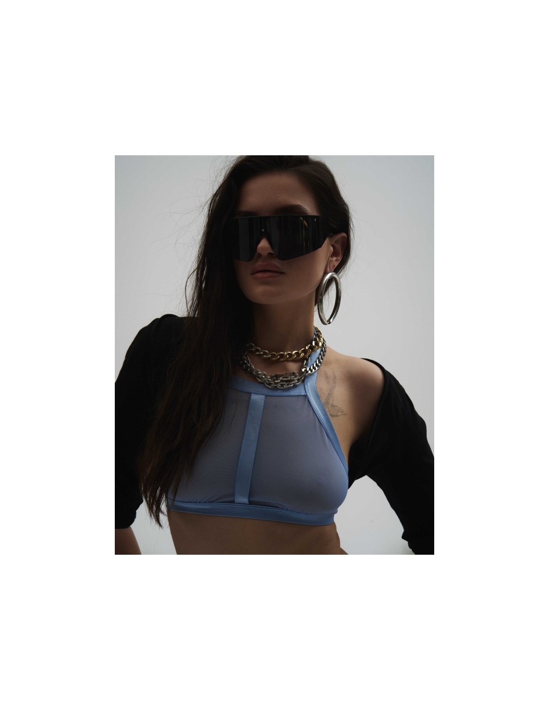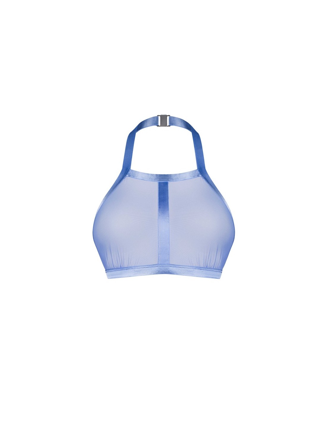 Ce Top "Shaderi Blue" épuré à la coupe moderne, est fabriqué dans un mélange de haute qualité d’élasthanne et de polyamide. Le filet transparent rencontre les garnitures brillantes et flexibles pour un look captivant. Une sangle ajustable ornée d’un fermoir argenté donne une touche de sophistication. La fixation multi-étagée sur le dos avec des crochets assure un port confortable.