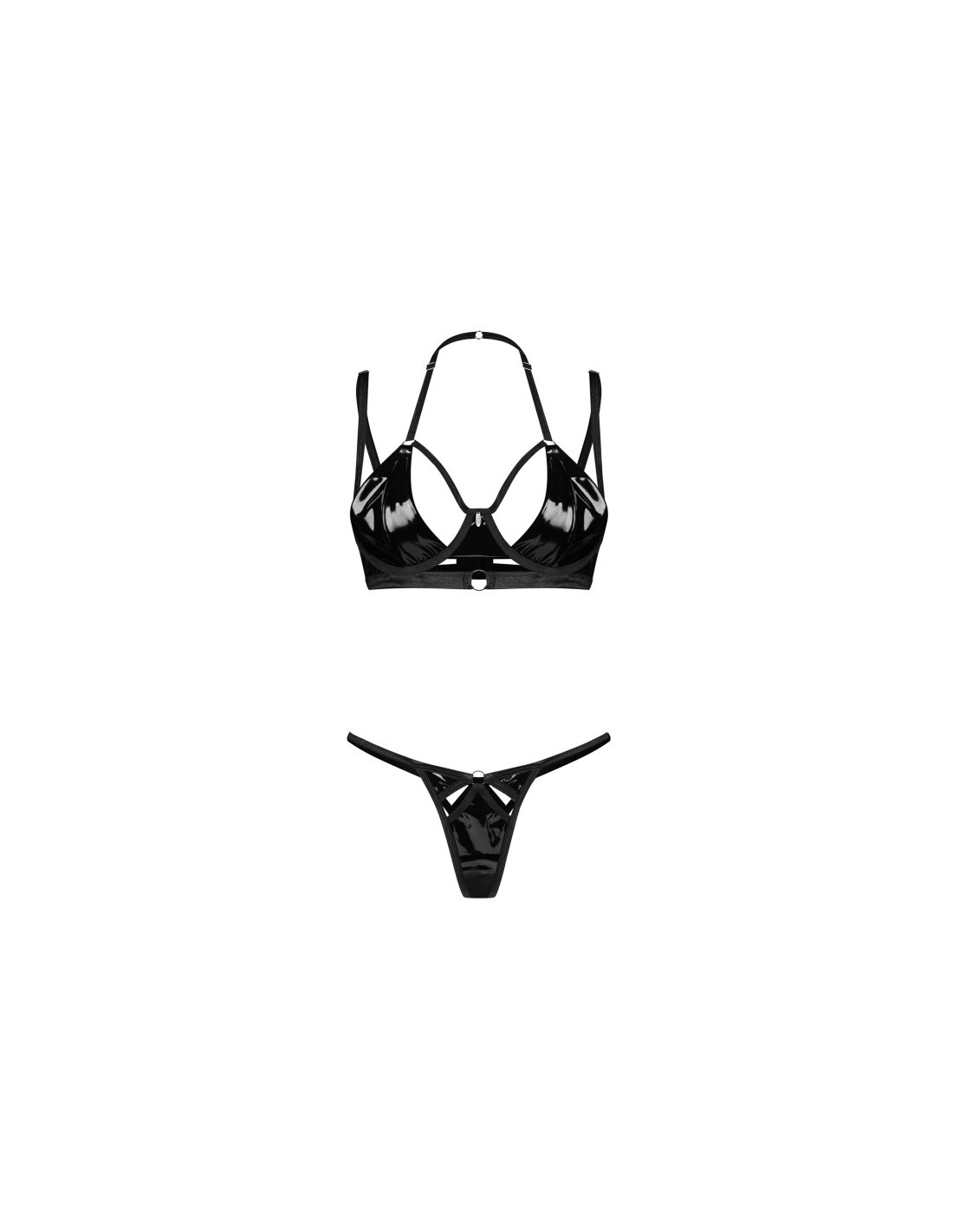 Cet ensemble 2 pièces noir est audacieux avec des inserts ressemblant au latex. Un soutien-gorge avec des bretelles accentuant la poitrine et un string avec des découpes tentantes. Le noir brillant ajoute un éclat séduisant, tandis que le design original renforce votre confiance. Une doublure spéciale assure le confort et des expériences purement agréables.