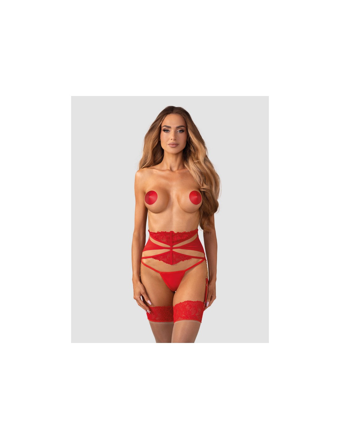 Ce porte-jarretelles rouge est en dentelle et en fine maille transparente. Doté de baleines verticales qui façonnent visuellement la silhouette et d’un design à lanières saisissant. La fermeture arrière à plusieurs étages permet un ajustement personnalisé. Les jarretelles sont connectées avec des chaînes dorées décoratives pour une finition élégante.