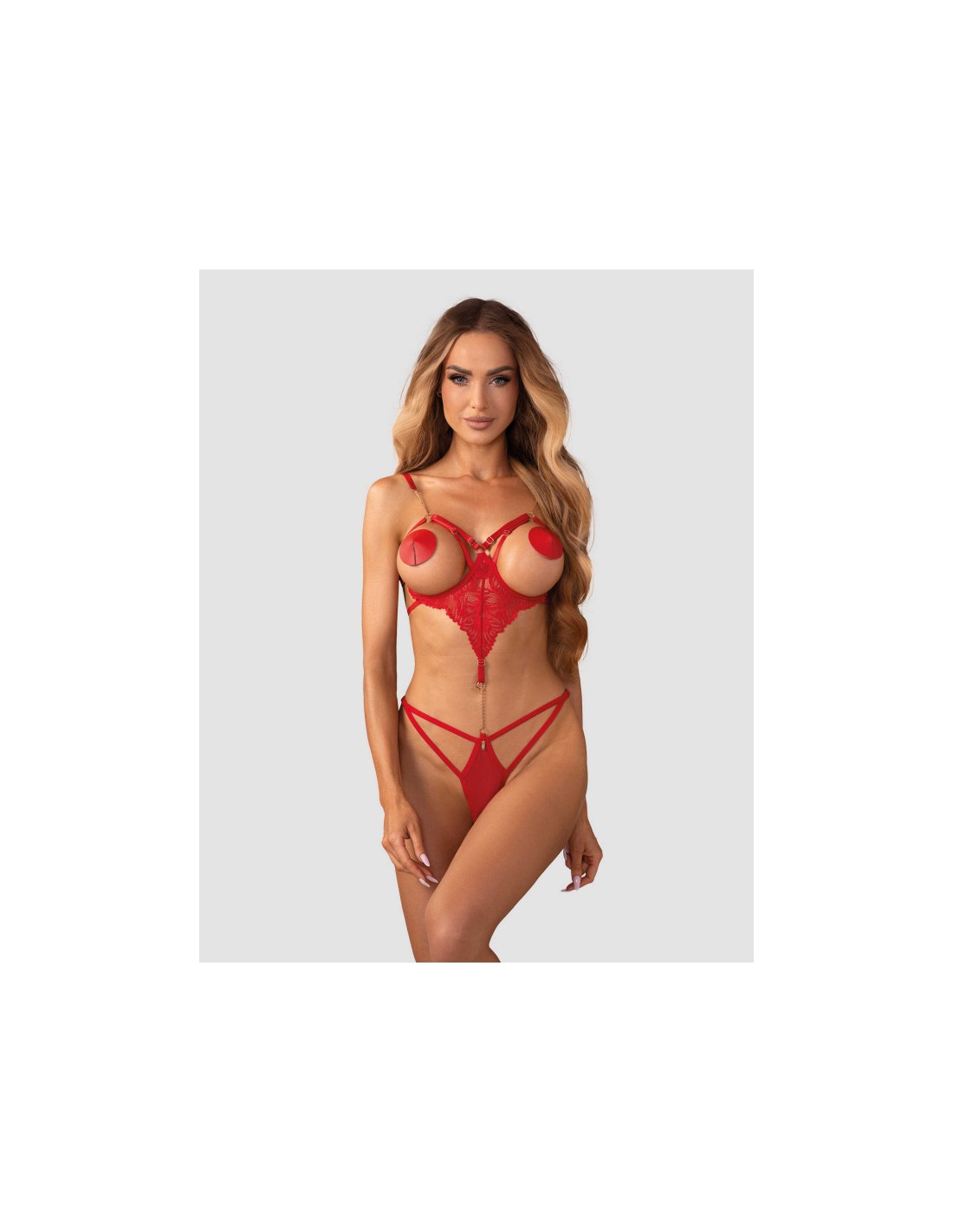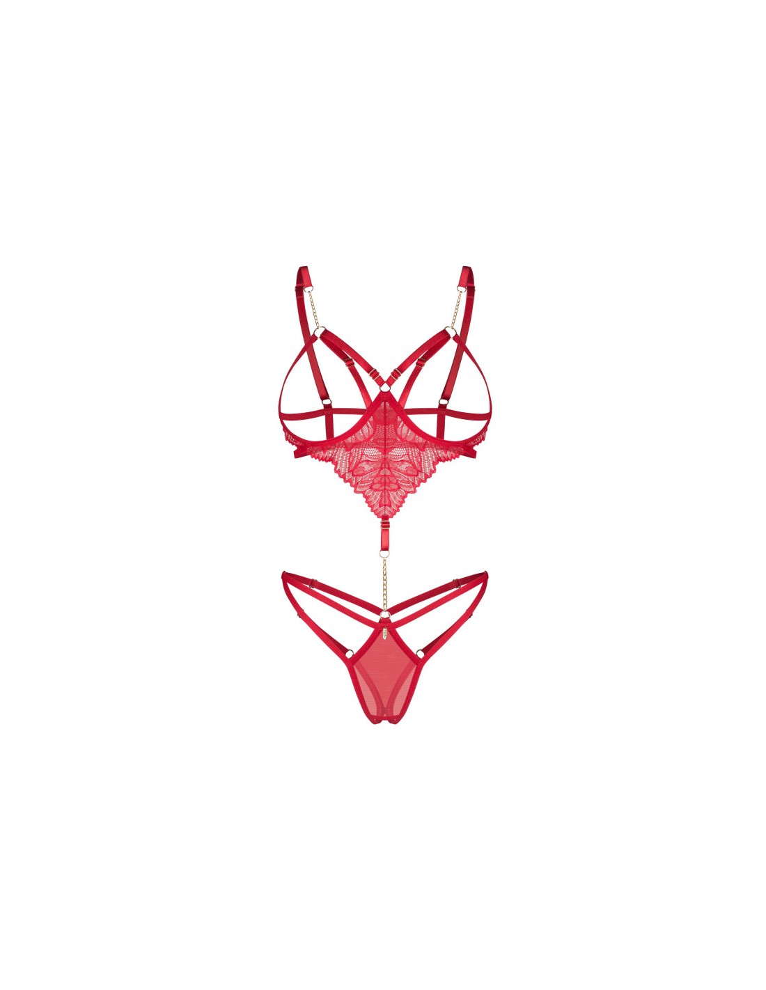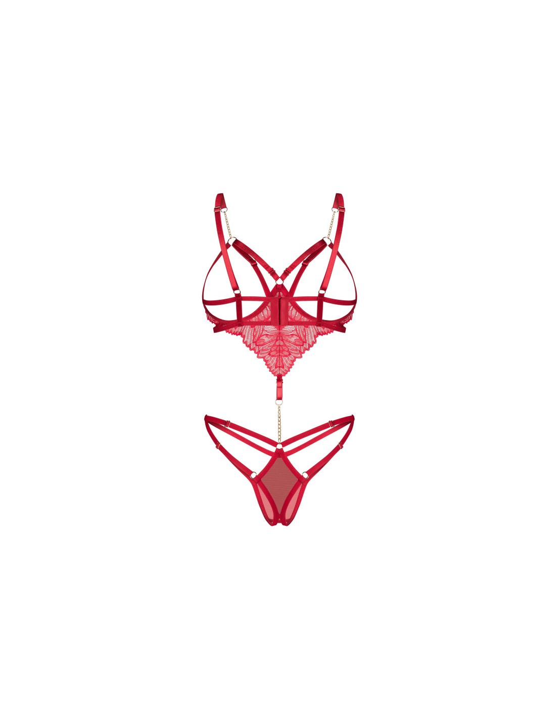 Ce body rouge est avec des bonnets ouverts à armatures qui soulèvent doucement le buste. Comprend des bretelles réglables pour un ajustement parfait. Fabriqué à partir de dentelle délicate et de fine maille. Le devant est orné d’une chaîne dorée qui relie de manière frappante le haut et le bas. Le design à entrejambe ouvert ajoute une touche épicée.