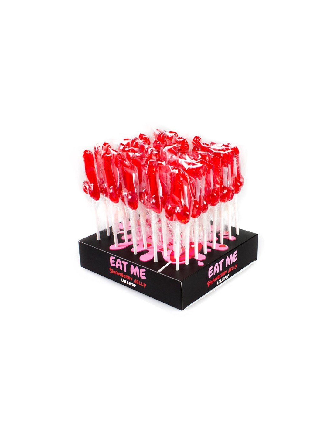 Nous sommes heureux de vous présenter ce présentoir de 40 sucettes comestibles en forme de pénis à la saveur de fraise de chez Secret Play.