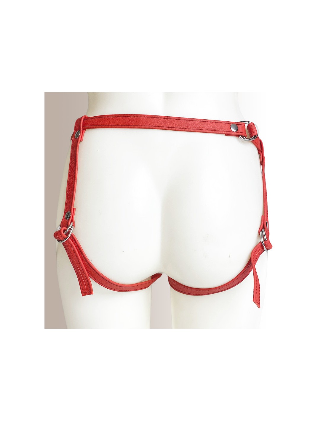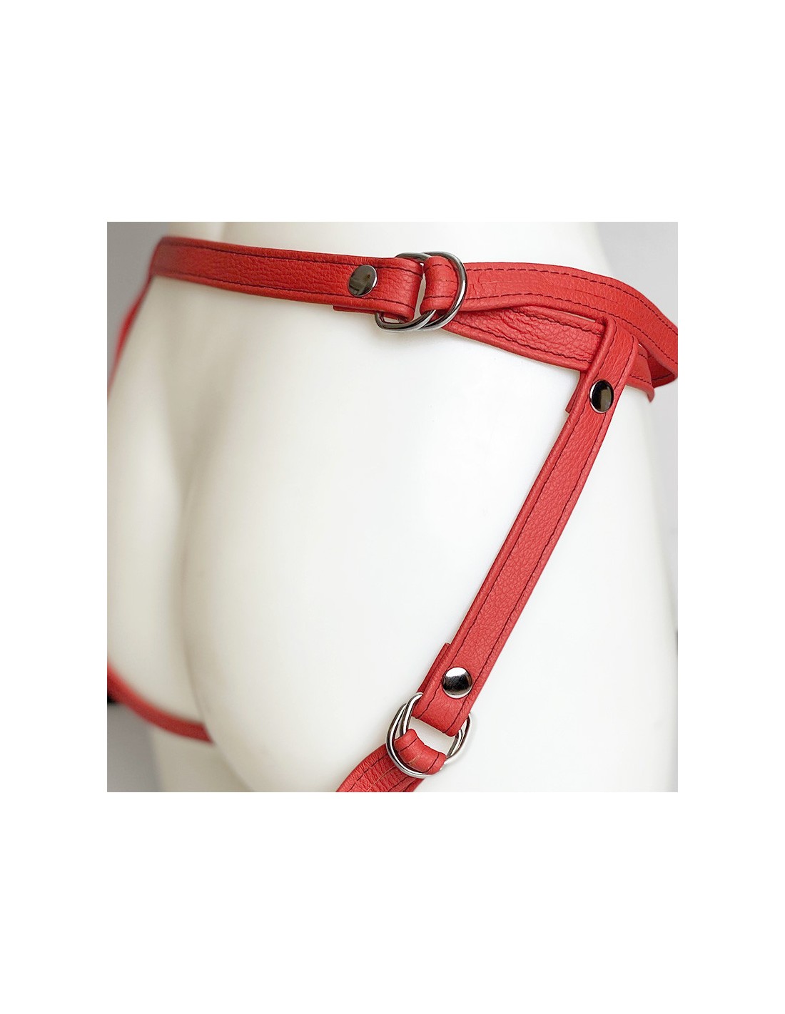 Ce modèle est en cuir souple, une matière douce pour la peau tout en étant incroyablement résistante. Une lanière passe autour de la taille et deux autres sur les fesses. Chacune ajustable d'un simple geste grâce aux anneaux, elles s'adaptent à toutes les morphologies. Contrairement aux boucles de ceinture, elles permettent d'être ajustées au millimètre près de façon très simple. Une fois réglées à votre taille, plus besoin d'y toucher, elles maintiennent le harnais, et donc le dildo, en place.