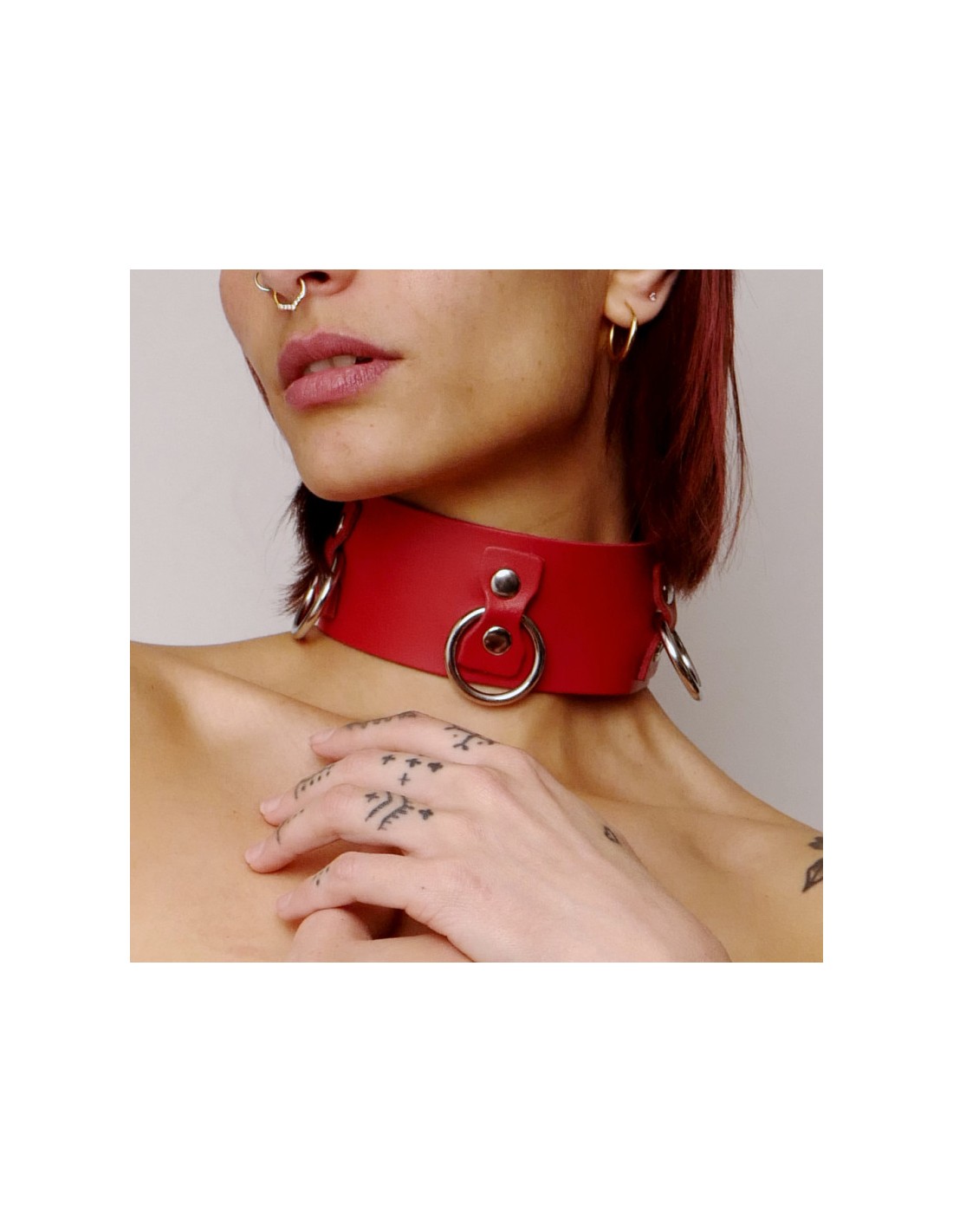 - Choker en cuir rouge et ses trois anneaux en acier pour contraindre de multiples façons.
