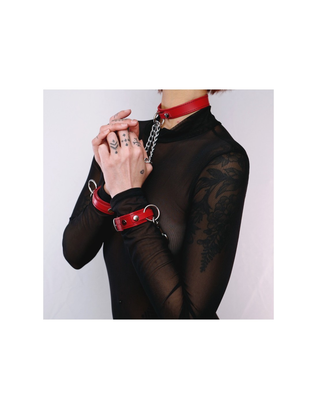 Cet accessoire de jeu est déclinable, aussi bien selon les scénarios que pour les occasions, puisqu'il peut également se porter comme bijou de corps. Ce kit est composé d'un collier fin muni d'un anneau d'attache dans lequel passe une chaîne qui le relie aux menottes fines assorties.